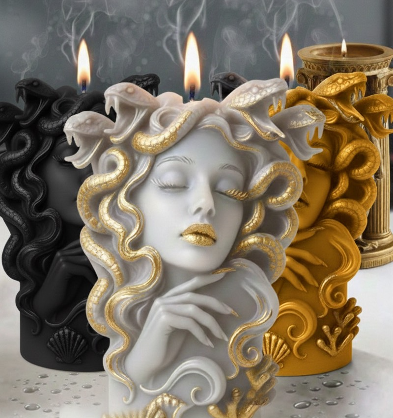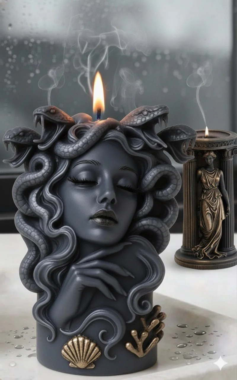 She stands as a sentinel, not of stone, but of hardened wax- a potent symbol for those who have forged their own path. Misunderstood, powerful, and utterly sovereign. Medusa embodies the quiet stregnth of a woman who chose herself. Her gaze doesn’t turn you to stone; it simply asks you to confront your own truth.